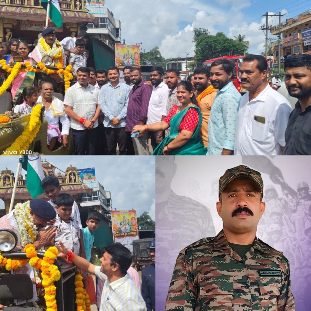 ಬೆಳ್ತಂಗಡಿ; ಭಾರತೀಯ ಸೇನೆಯಲ್ಲಿ 22 ವರ್ಷಗಳ ಕಾಲಸೇವೆ ಸಲ್ಲಿಸಿ ನಿವೃತ್ತರಾಗಿ ಊರಿಗೆ ಹಿಂತಿರುಗಿದ ಬೆಳ್ತಂಗಡಿ ತಾಲೂಕಿನ ಲಾಯಿಲ ಗ್ರಾಮದ ವಿವೇಕಾನಂದ ನಗರ ನಿವಾಸಿ ಎನ್.ಕೆ ಅಶೋಕ್ ಕುಮಾರ್ ಅವರಿಗೆ ಬೆಳ್ತಂಗಡಿಯಲ್ಲಿ ಸಾರ್ವಜನಿಕರು ಭವ್ಯ ಸ್ವಾಗತ ಕೋರಿದರು.