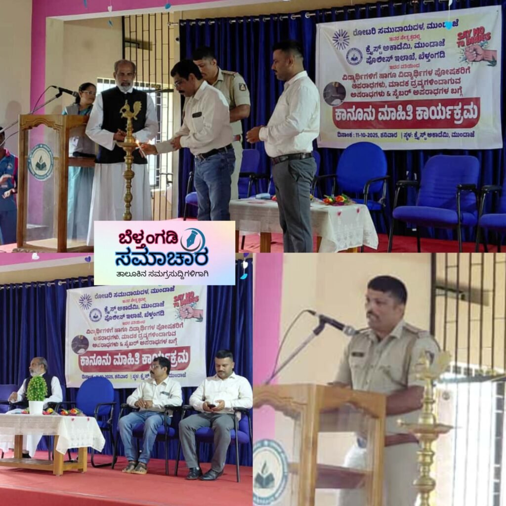 ಬೆಳ್ತಂಗಡಿ; ರೋಟರಿ ಸಮುದಾಯ ದಳ ಮುಂಡಾಜೆ, ಕ್ರೈಸ್ಟ್ ಅಕಾಡೆಮಿ ಮುಂಡಾಜೆ, ಪೊಲೀಸ್ ಇಲಾಖೆ ಬೆಳ್ತಂಗಡಿ ಇದರ ಸಹಯೋಗದೊಂದಿಗೆ ವಿದ್ಯಾರ್ಥಿಗಳಿಗೆ ಹಾಗೂ ಪೋಷಕರಿಗೆ ಅಪರಾಧಗಳು, ಮಾದಕ ದ್ರವ್ಯಗಳಿಂದಾಗುವ ಅಪರಾಧಗಳು, ಹಾಗೂ ಸೈಬರ್ ಅಪರಾಧಗಳ ಬಗ್ಗೆ ಕಾನೂನು ಮಾಹಿತಿ ಕಾರ್ಯಾಗಾರ ನಡೆಯಿತು.