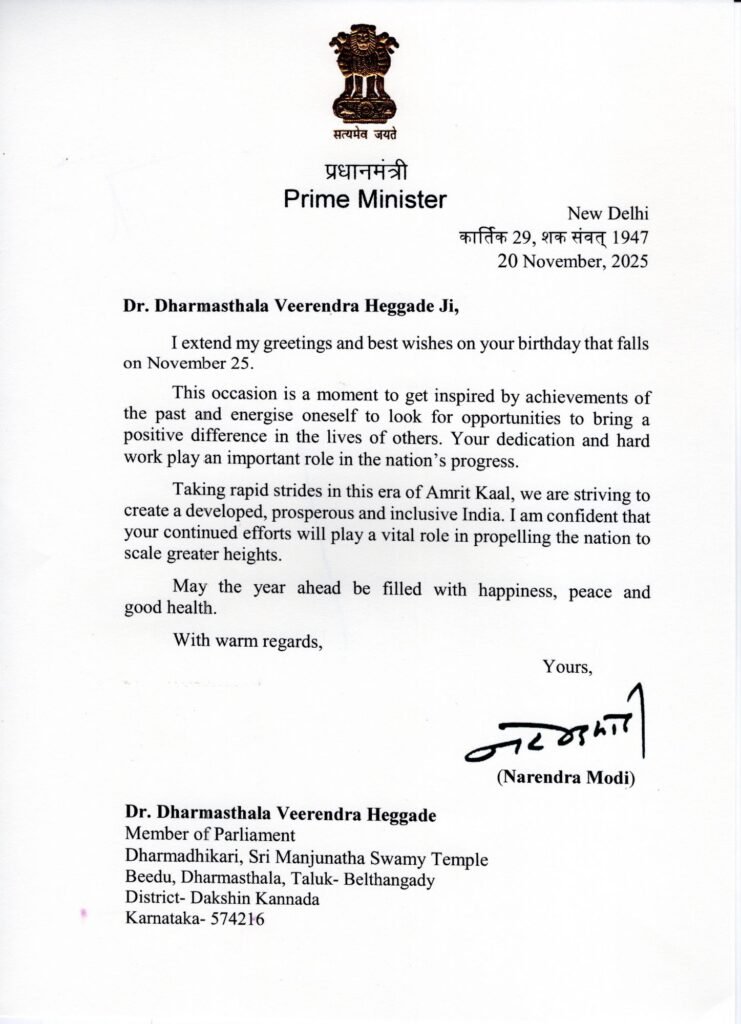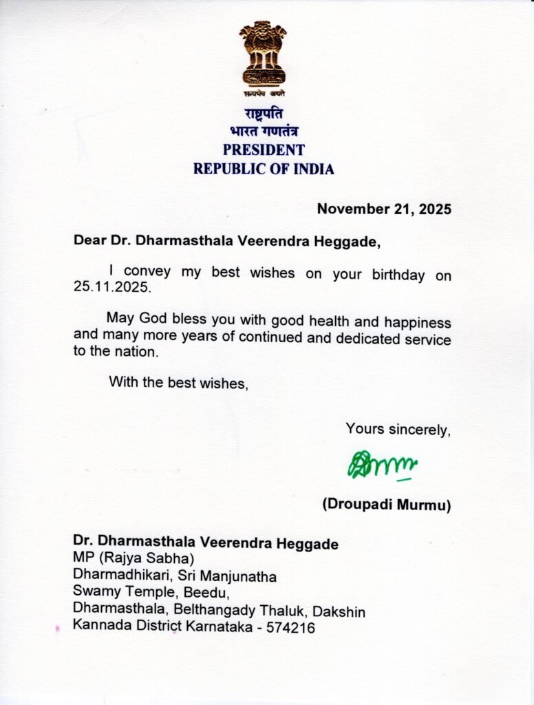 ರಾಷ್ಟ್ರ ಪತಿ ದ್ರೌಪದಿ ಮುರ್ಮು, ಗೃಹ ಸಚಿವ ಅಮಿತ್ ಷಾ ಸೇರಿದಂತೆ ಹಲವರು ಗಣ್ಯರು ಪತ್ರದ ಮೂಲಕ ಡಾ. ಹೆಗ್ಗಡೆಯವರಿಗೆ ಶುಭಾಶಯ ಕೋರಿದರು.