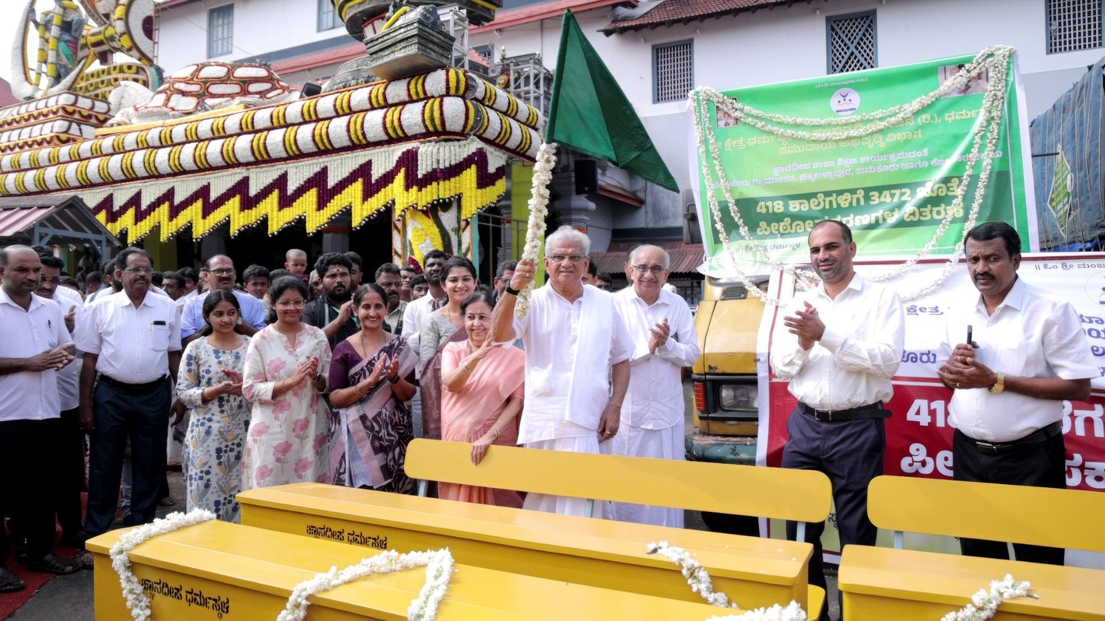 ಅವರು ಗುರುವಾರ ಧರ್ಮಸ್ಥಳದಲ್ಲಿ ಬೆಂಗಳೂರು ಗ್ರಾಮಾಂತರ, ಚಿಕ್ಕಬಳ್ಳಾಪುರ, ತುಮಕೂರು ಮತ್ತು ಕೋಲಾರ ಜಿಲ್ಲೆಗಳ 418 ಶಾಲೆಗಳಿಗೆ 3,472 ಜೊತೆ ಡೆಸ್ಕ್-ಬೆಂಚ್ಗಳ ವಿತರಣೆಗೆ ಚಾಲನೆ ನೀಡಿ ಶುಭ ಹಾರೈಸಿದರು.