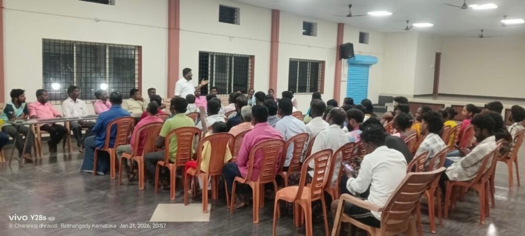 ಬೆಳ್ತಂಗಡಿ; ಅಲೆರಿ ಶ್ರೀ ಸತ್ಯ ಸಾರಾಮಾನಿ ಕಾನದ – ಕಟದ ಮೂಲ ಕ್ಷೇತ್ರ ಆಲೇರಿ,ಮಿಜಾರು ಮೂಡಬಿದ್ರೆ ತಾಲೂಕು , ದಿನಾಂಕ 8.2.2026 ನೆ ಆದಿತ್ಯವಾರ ನಡೆಯುವಂತಹ ಶಿಲಾನ್ಯಾಸ ಕಾರ್ಯಕ್ರಮದ ಪೂರ್ವ ಸಿದ್ಧತೆ ಸಭೆಯನ್ನು ಕುಕ್ಕೇಡಿ – ನಿಟ್ಟಡೆ, ಗ್ರಾಮದ ಡಾ . ಬಿ.ಆರ್. ಅಂಬೇಡ್ಕರ ಭವನದಲ್ಲಿ ಸಡೆಸಲಾಯಿತು. ಈ ಕಾರ್ಯಕ್ರಮದಲ್ಲಿ ತಾಲೂಕು ಸಮಿತಿಯ ಅಧ್ಯಕ್ಷರಾದ ಚಂದ್ರಪ್ಪ ಮಾಸ್ಟರ್, ಮತ್ತು ತಾಲೂಕು ಸಮಿತಿ ಉಪಾಧ್ಯಕ್ಷರಾದ ಶೇಖರ್.ವಿ.ಧರ್ಮಸ್ಥಳ , ಮತ್ತು ಕೇಂದ್ರ ಸಮಿತಿಯ ಕೋಶಾಧಿಕಾರಿ ಯಾದ ಶೇಖರ್ ಕುಕ್ಕೇಡಿ ಭಾಗವಹಿಸಿದರು, ಕ.ದ.ಸಂ.ಸ ಹೋಬಳಿ ಸಂಚಾಲಕರಾದ ಚರಣ್ ಕುಕ್ಕೇಡಿ ಇವರು ಸ್ವಾಗತ ಮಾಡಿದರು ಮತ್ತು ಕುಕ್ಕೇಡಿ ಗ್ರಾಮ ಸಮಿತಿಯ ಪದಾಧಿಕಾರಿಗಳನ್ನು ವಿಸ್ತರಣೆ ಮಾಡಲಾಯಿತು.. ಗೌರವ ಅಧ್ಯಕ್ಷರಾದ ಕೃಷ್ಣಪ್ಪ ನೆಲ್ಲಿಗುಡ್ಡೆ ,ಅಧ್ಯಕ್ಷರಾಗಿ. ಸಂಜೀವ ಪಿಲಿಯೂರು , ಉಪಾಧ್ಯಕ್ಷರಾಗಿ ನವೀನ್ ಕಾಂಜರಕಟ್ಟೆ, ಇನ್ನೋರ್ವ ಉಪಾಧ್ಯಕ್ಷರಾಗಿ , ವಸಂತ ನಿಟ್ಟಡೆ, ಕಾರ್ಯದರ್ಶಿಯಾಗಿ ಆನಂದ ಅಮೈಪಲ್ಕೆ, ಜೊತೆ ಕಾರ್ಯದರ್ಶಿಯಾಗಿ ನಾಗಮ್ಮ ಕಾಂಜರಾಕಟ್ಟೆ.ಕೋಶಾಧಿಕಾರಿಯಾ ಗಿ ಪೂರ್ಣಿಮಾ ನಿಟ್ಟಡೆ, ಕಾರ್ಯಕಾರಿಣಿ ಸಮಿತಿ ಸದಸ್ಯರುಗಳು