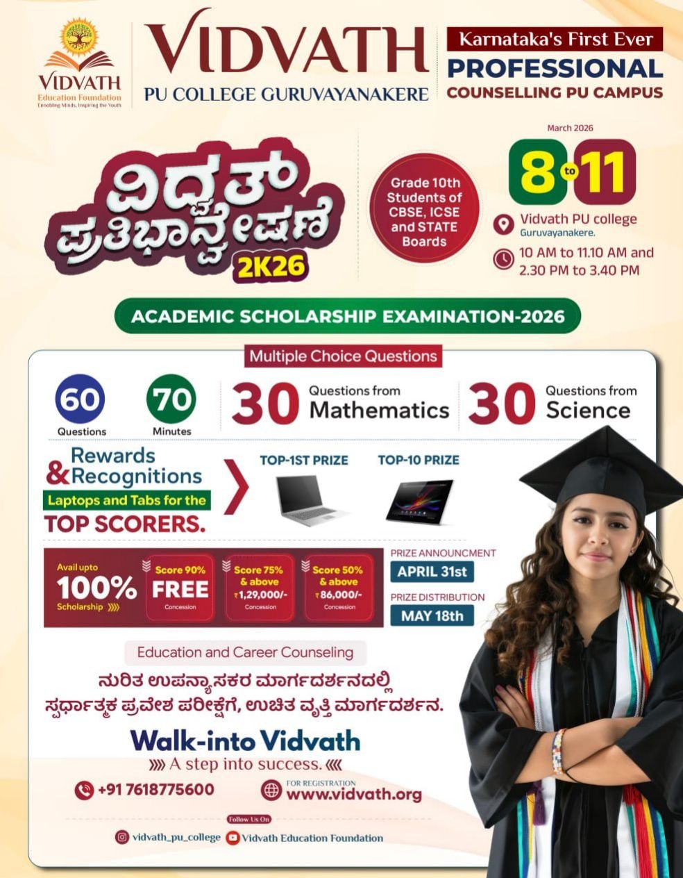 ಮಾ 8 ರಿಂದ 11 ರ ವರೆಗೆ 10ನೇ ತರಗತಿ ವಿದ್ಯಾರ್ಥಿಗಳಿಗಾಗಿ ವಿದ್ವತ್ ಕಾಲೇಜಿನಿಂದ ಪ್ರತಿಭಾನ್ವೇಷಣೆ ಪರೀಕ್ಷೆ – 2026