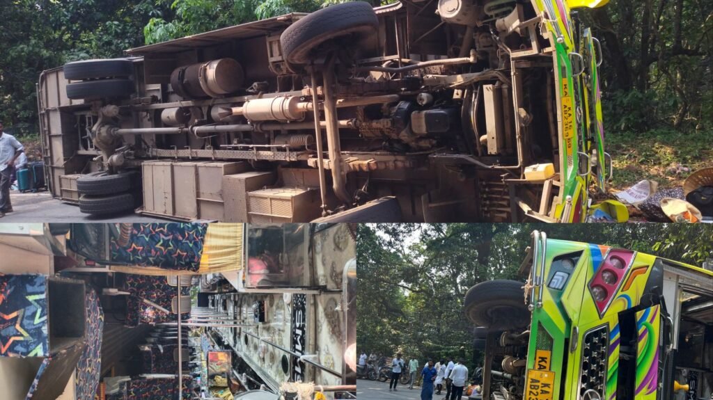 ಬೆಳ್ತಂಗಡಿ ಚಾರ್ಮಾಡಿ ಘಾಟ್ ರಸ್ತೆಯ ತಿರುವಿನಲ್ಲಿ ಬಸ್ ಪಲ್ಟಿಯಾಗಿ 20 ಕ್ಕಿಂತಲೂ ಅಧಿಕ ಮಂದಿ) ಗಾಯಗೊಂಡ ಘಟನೆ ಭಾನುವಾರ ಮಧ್ಯಾಹ್ನ ನಡೆದಿದೆ ಆಂಧ್ರ ಮೂಲದ